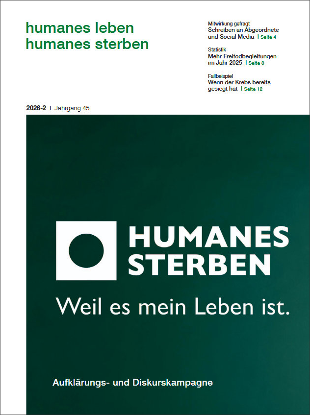 In dieser Ausgabe geht es um die neue DGHS-Aufklärungs- und Diskurskampagne „Humanes Sterben. Weil es mein Leben ist“, u.a. mit der Kampagnen-Website humanes-sterben.info, die Mitglieder-Testimonials, Video-Podcast- und Social-Media-Beiträge präsentiert sowie die Möglichkeit bietet, die jeweils regional zuständigen Bundestagsabgeordneten direkt zu kontaktieren, um die Zukunft der Gesetzgebung bei Freitodbegleitungen anzusprechen.